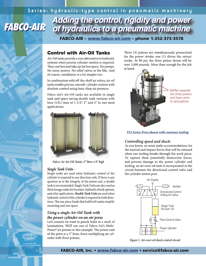 When your system requires hydraulic-type motion control, Air-Oil Tanks provide high precision, smooth speed and excellent rigidity when used with off-the shelf air valves and shop air. Air-Oil Tanks don’t require motors, pumps, relief valves and other components, so they’re cost effective and save space. Fabco-Air offers two types of Air-Oil Tanks: Single-tank units for when hydraulic control of the cylinder is required in one direction, and double-tank units when bi-directional cylinder control is needed. Single-tank units can also be used as storage tanks in booster systems or for hydraulic shock control. Double-tank units are particularly space-efficient thanks to the one-piece head that holds both tanks in place and also simplifies mounting.