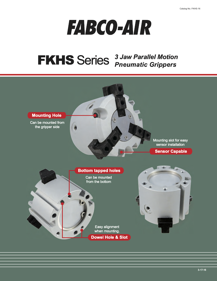 The FKHS Series has a compact design, three-pronged gripper and excellent repeatability. The three-pronged design allows more contact on the grasping part for more accurate centering when compared to two-pronged grippers. Direct body mounting holes on the top and bottom of the gripper make for easy alignment while mounting. Simple and cost-effective, these parallel grippers are well-suited for high-precision jobs in compact spaces.