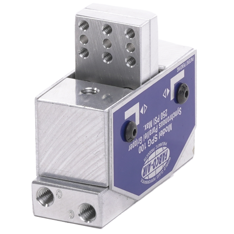 With the SPG, there are no troublesome gibs to wear or adjust. Four dowel pins align the porting block perfectly with the cylinder blocks. Eight high-performance linear bearings guide the four pistons through the entire length of the gripper body. Centering accuracy maintains to 0.002 inch and side play is 0.0015 or less per jaw.