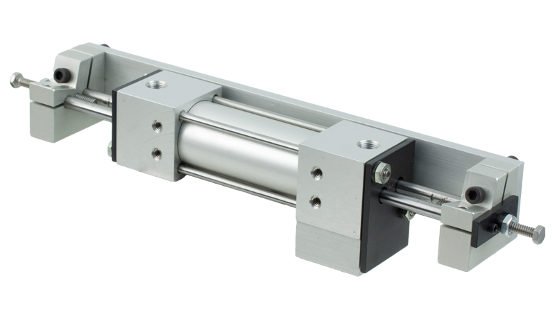 The TS Series Pneumatic Linear Slide features a twin-shaft, air or hydraulic powered integral slide system with maximum operating pressure of 150 psi (air or oil-based hydraulics). Because the slide is built into the cylinder, the TS Series is well suited for space-constrained applications. Featuring a high load capacity, the TS Series is designed with two linear ball bearings at each end of the cylinder to provide no-play precision motion. The cylinder tube, end caps and piston are built from aluminum alloy materials, and the linear ball bearings are full steel.